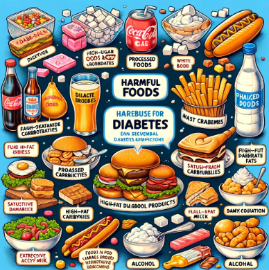 소다, 과일 주스, 케이크, 쿠키, 사탕과 같은 설탕이 많이 들어간 음식과 음료는 혈당 수치를 빠르게 높이며 당뇨병 관리에 해롭습니다.